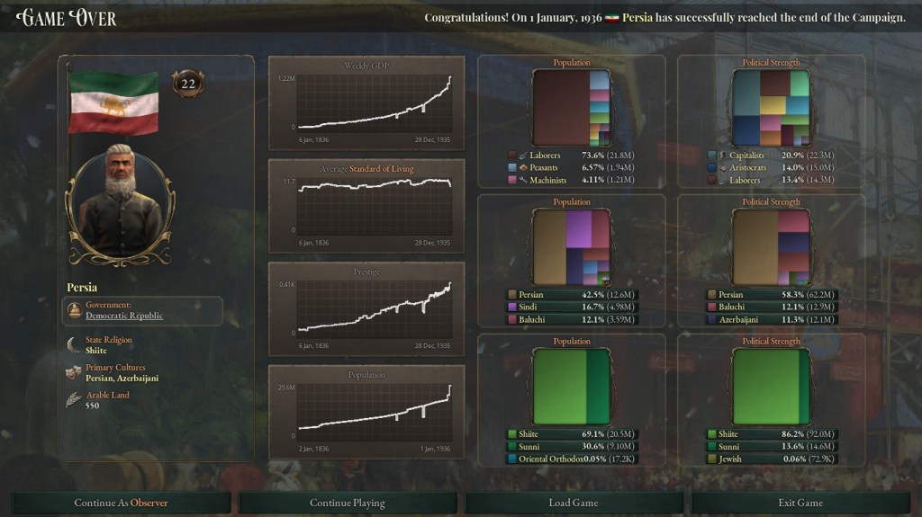 Okay, this is starting to get a bit too long for a short review, and a bit rambly, so I’m going to go with some things I don’t like. First off, data presentation. There are a lot of graphs in Victoria 3, but you can’t change the dates on them. GDP, for example, goes from the start date of the game to whenever you are now. Which is great for seeing how much better you’re doing; but the longer you go, the more zoomed out it gets. Sometimes you want to see the last decade, after you’ve made some big changes. On the other had, the graph for radicals and loyalists is really small. Since I was (and still am) learning, I had a hard time changing standard of living among pops, which is what creates radicals and loyalists. As a result, those short graphs were nearly parallel to the x-axis the whole game; it was going up and down, but it was hard to see. A longer time frame would have helped a lot. Having the ability to change the time frame would be a huge benefit to a game about economy, which turns out graphs are a big part of. Finally, sometimes you’ll see the line actually leave the graph. Generally this happens because of huge but short spikes in the price of an item. When you start producing cars, for example, the demand for and price of engines is going to skyrocket for a few weeks or months. But then the engine manufactures are going to start hiring people and creating product, which will drop the price back down. As annoying as this is, there’s probably no way to fix it without zooming the graph out so far you can’t actually read it, so it’s forgivable. I just wish the line would stop at the edge of the graph, instead of leaving it.
