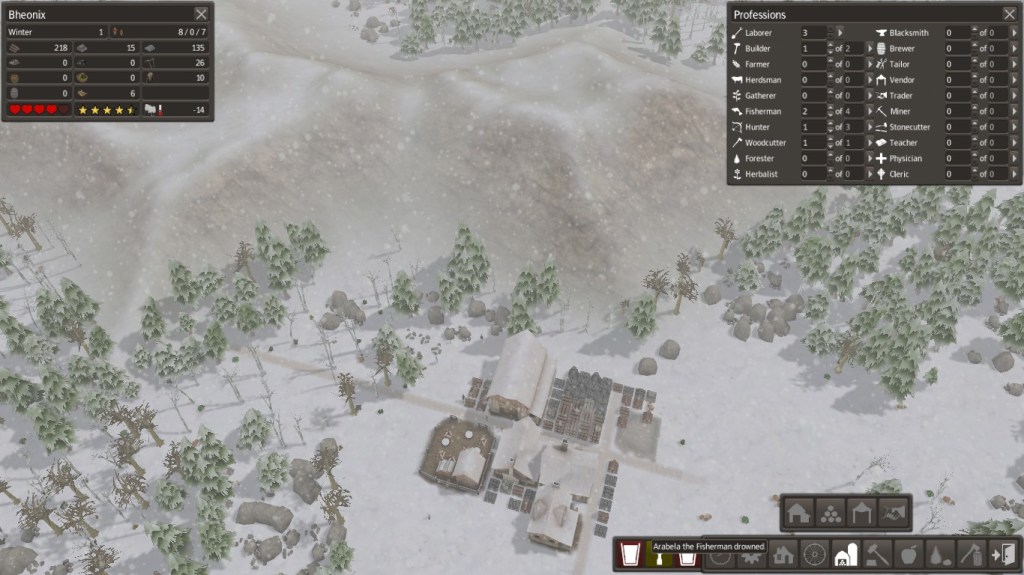 Now, I’m not saying Banished is the perfect game, no perfect game exists. One of the biggest sorta problems is the trade. It’s entirely a barter system, there is no currency. Which, for a game where steel exists, is kind of weird. Steel tools are a lot more recent than money. I don’t think that’s bad, but I would like it if it were part of the difficulty settings when you create a new game. If you want currency to hold you over between traders, rather than stocking up your multiple trading posts (each trader only visits one, so you have to hope the right one goes to the right place, another annoyance), you could do it. If you wanted to play like it is now, with a little more luck, you could do that, too. The food system is frustrating, as well. It never spoils, so once you’ve gotten into the groove, your food you’ve set aside is going to just keep growing and growing. You’ll probably hit your stock cap and have to raise it, your town’s growth held back by the amount of resources you have to build houses rather than the ability to feed the people inside those houses. Or at least I do. It can get a it boring to toss thousands of fish in a trading post because you simply have no other use for them.