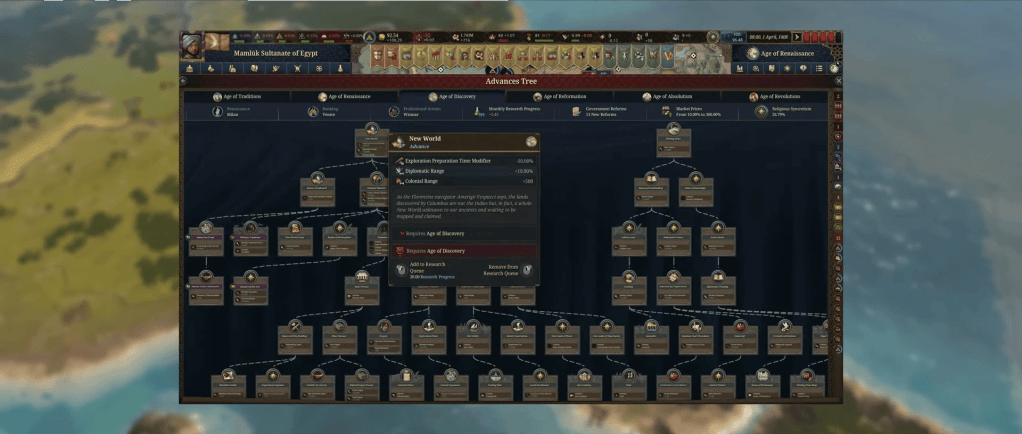 Something else in the game is the eras it goes through. Europa Universalis V starts in 1337 (no, not leet, that’s the start of the Hundred Years War) and ends in 1837. Throughout this half millennium, you’ll pass through six different Institutions. Unlike EU4‘s Institution system, which simply hinders you until you embrace a new one, embracing an Institution in EU5 will unlock a brand new technology tree. While traversing this tree, you can take multiple paths to do different things. For example, going down the New World branch in the Age of Discovery Institution will make it much easier to colonize. Going down a different path will still allow you to colonize, and any country can, but wanting to be a colonist is the easiest way to be a colonist. And this means that not wanting to be a colonist will make it much easier to do what you want to do.